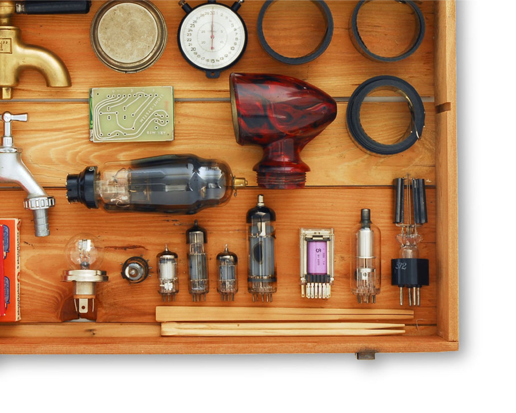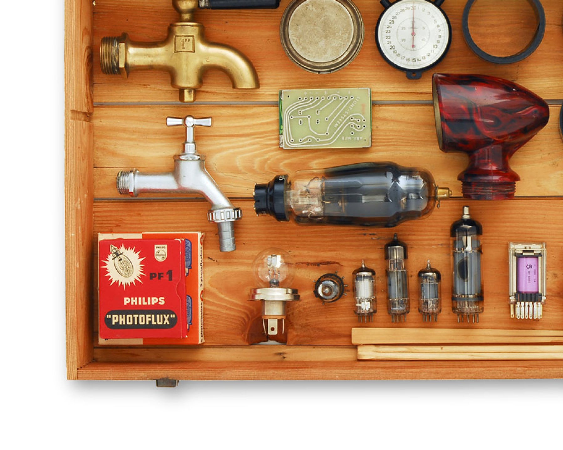 “Memory Boxes”, the ready made in a box. Common objects that dialogue with each other inside a container that holds them. Marco Morosini has collected over time simple objects that recall a past, tell a story. Through a precise composition, he creates new microcosms where each subject reflects the history of his neighbor. Each composition is frozen thanks to a zenith photograph.