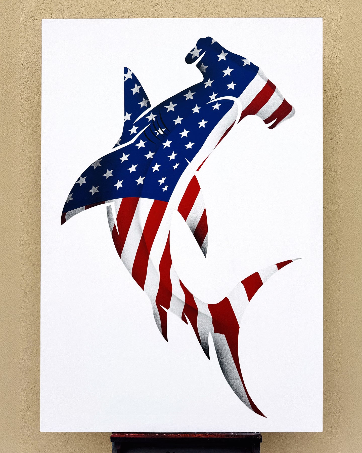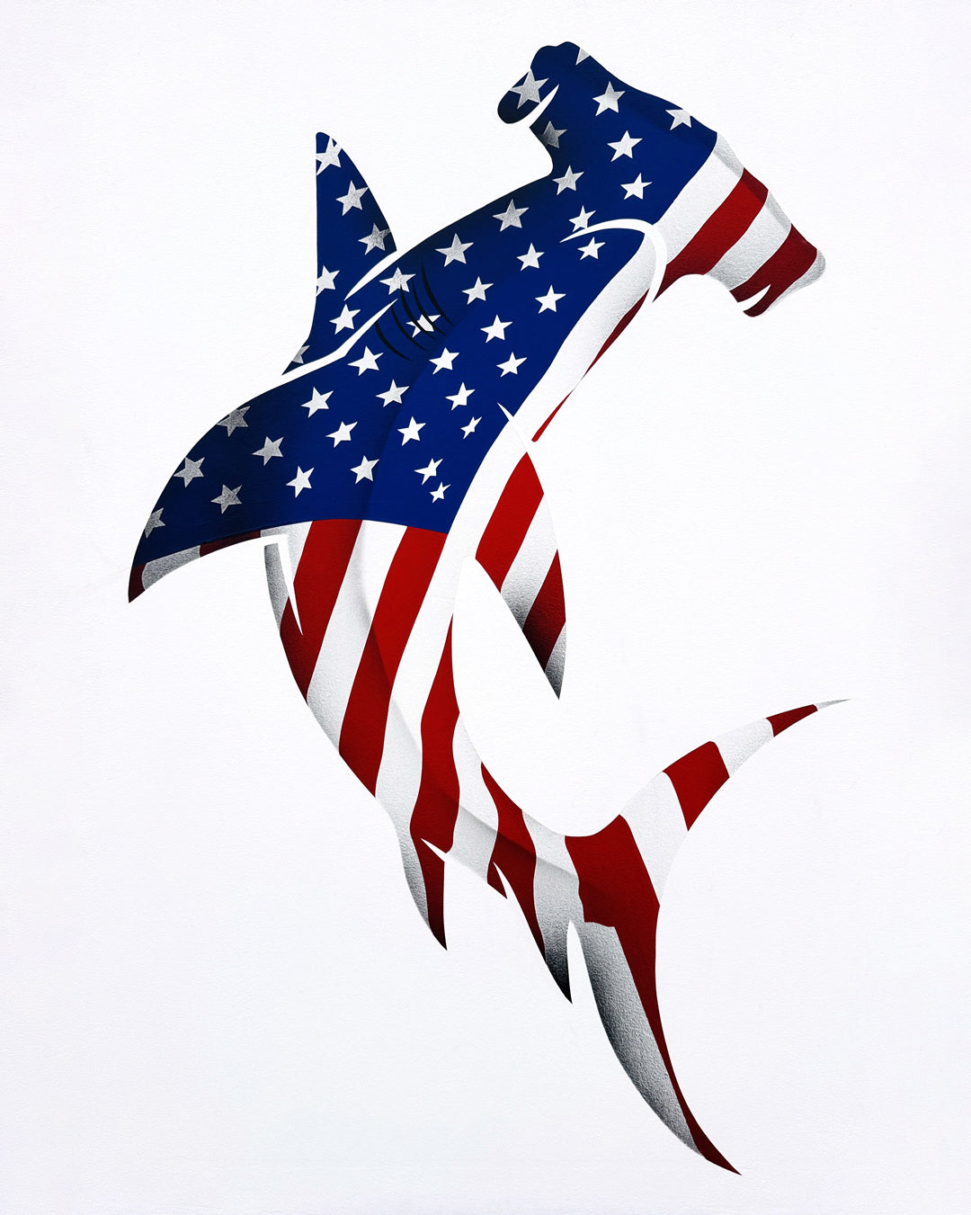 The predator as an archetype of power. The American Shark by Marco Morosini is not a representation, but a geopolitical simulacrum: a figure that dominates space through the tension between the rigor of acrylic and the violence of spray paint.
