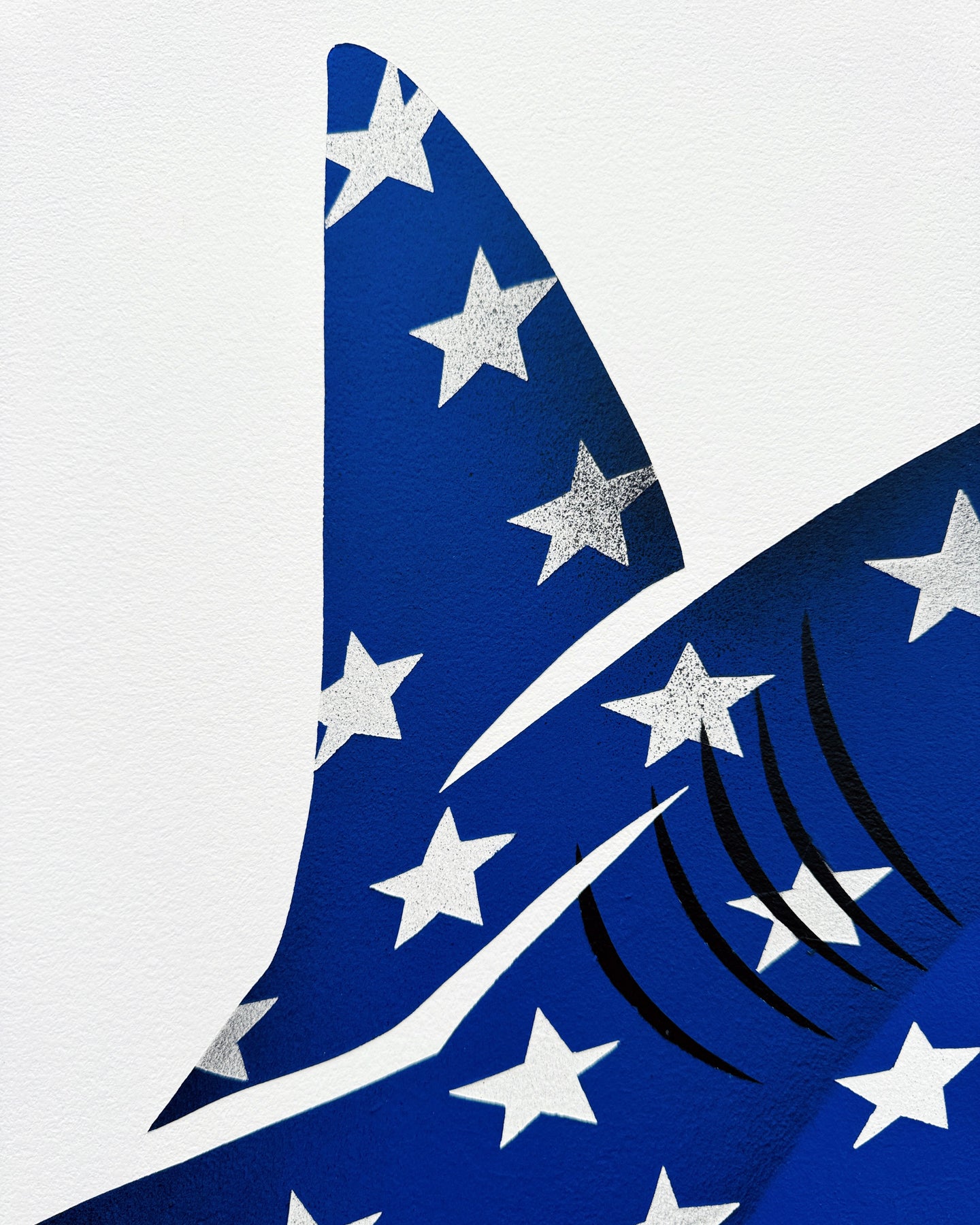 Il predatore come archetipo del potere. Lo Squalo Americano di Marco Morosini non è una rappresentazione, ma un simulacro geopolitico: una figura che domina lo spazio attraverso la tensione tra il rigore dell'acrilico e l'irruenza dello spray.